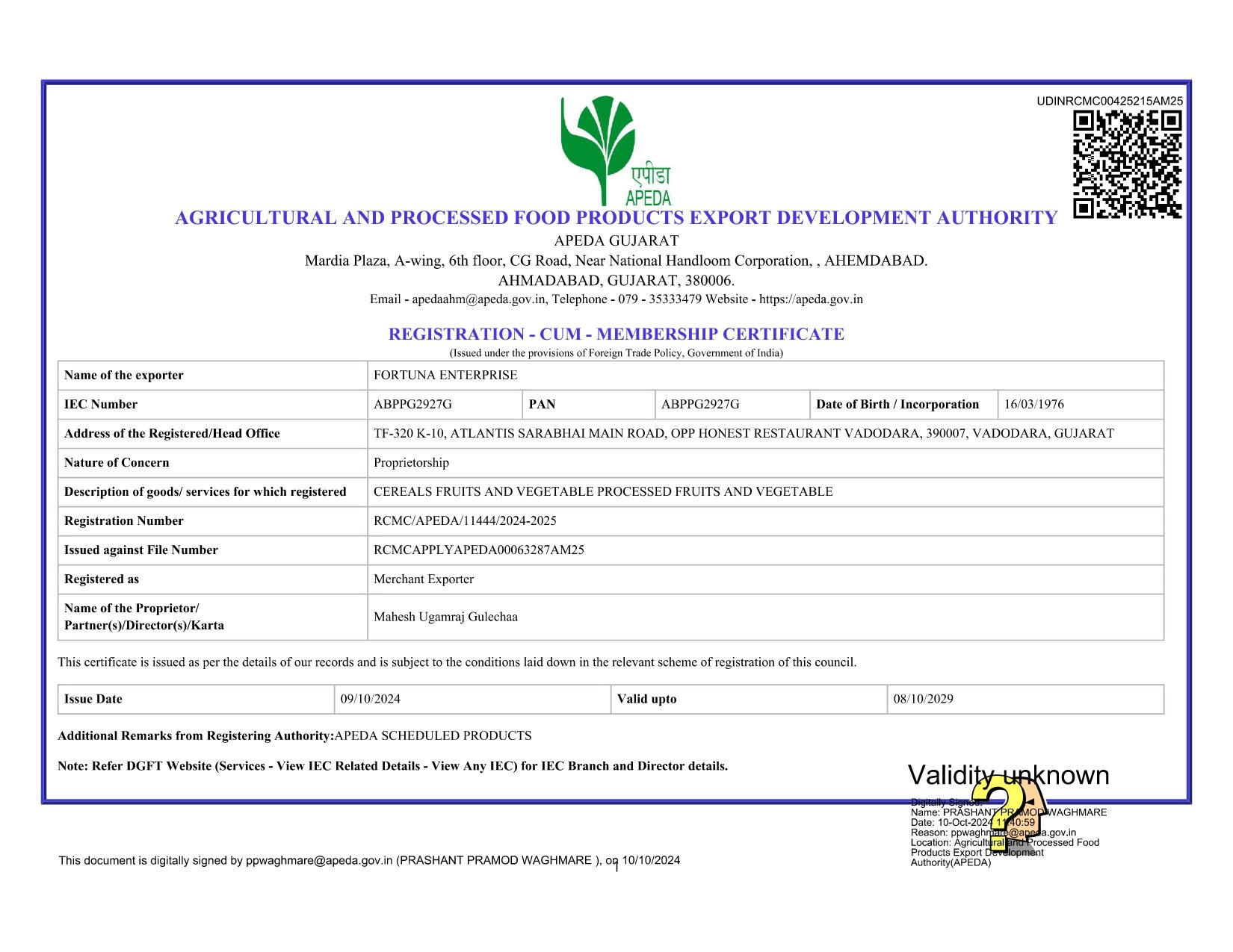 Apeda Certificate