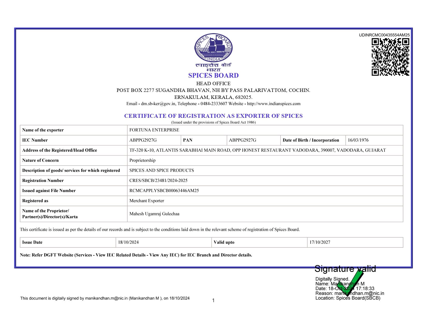 Spices Certificate
